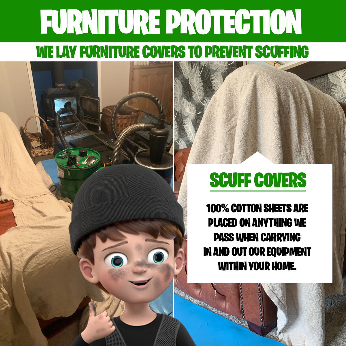 Not only do we cover your carpets and hearth, we also cover the appliance with plastic sheeting! This prevents any soot entering your room.